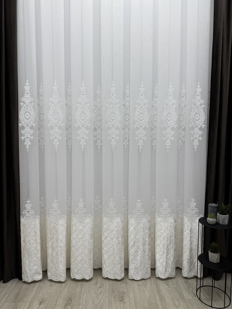 Тюль на бамбуковій основі з оксамитовими вставками та красивою вишивкою. Колір: молочний